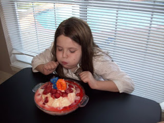 Dad made Madi Grace’s cake because she wanted a cheesecake ice cream cake. No one around here makes them – so Dad to the rescue. He added strawberries and made a strawberry syrup to go on top. Oh, talk about DELICIOUS!!!!!! Mmmm!